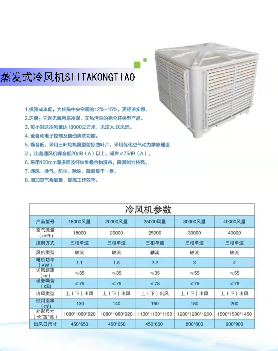從工廠車間到商業(yè)場所,從倉儲(chǔ)物流到戶外臨時(shí)空間,蒸發(fā)式冷風(fēng)機(jī)憑借靈活便捷的安裝方式與卓越性能,成為各行業(yè)的降溫優(yōu)選。模塊化設(shè)計(jì)支持多臺(tái)組合,滿足不同場景需求;智能控制系統(tǒng)可遠(yuǎn)程調(diào)節(jié)風(fēng)速、濕度,操作簡單便捷。選擇蒸發(fā)式冷風(fēng)機(jī),不僅是選擇一份清涼,更是擁抱一種綠色節(jié)能的生活方式。